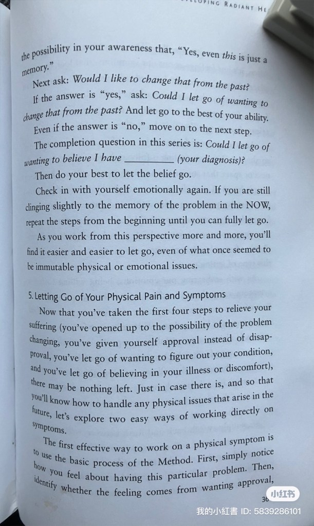 Now that you’ve taken the first four steps to relieve your suffering (you’ve opened up to the possibility of the problem changing, you’ve given yourself approval instead of disapproval, you’ve let go of wanting to figure out your condition, and you’ve let go of believing in your illness or discomfort), there may be nothing left. Just in case there is, and so that you’ll know how to handle any physical issues that arise in the future, let’s explore two easy ways of working directly on symptoms.